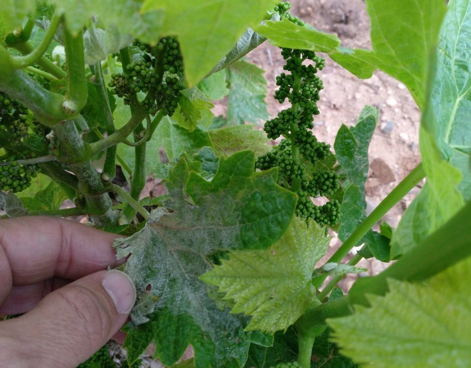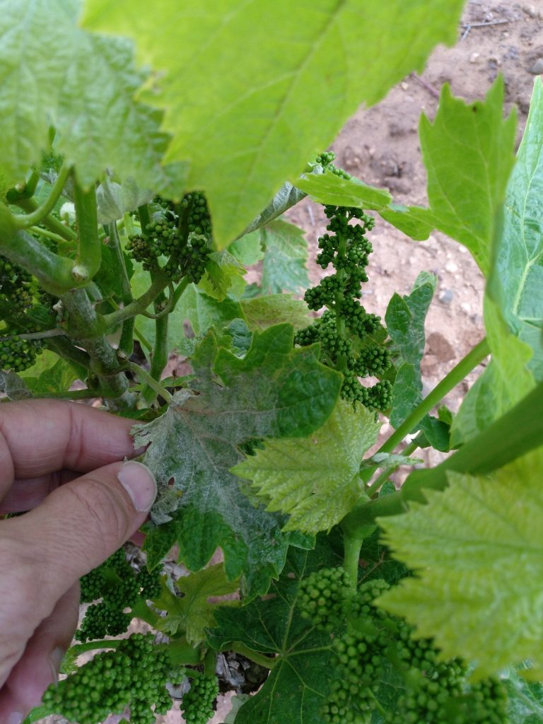 Algunas de las consecuencias de esta primavera tan lluviosa es el desarrollo del hongo Oidio (Uncinula necator) en una variedad especialmente sensible como es el Mazuelo. #CulturaVitícola De momento todo controlado.